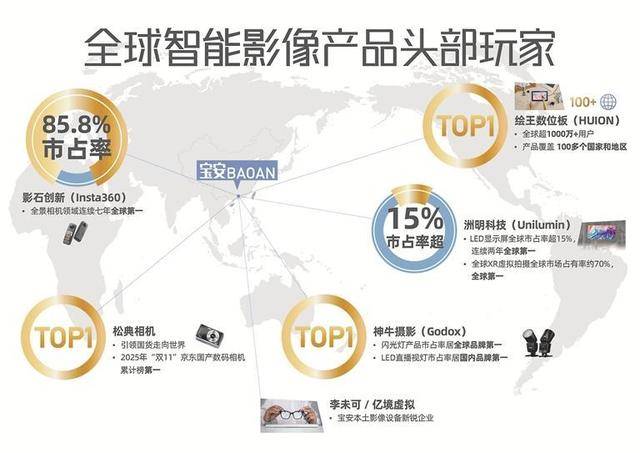 以宝安为例,作为智能影像产业核心承载区,全区262家影像相关企业织就产业网络,形成以影石创新为全球品牌标杆、腾讯系内容生态为链主牵引,洲明、神牛等多领域企业协同支撑的发展格局。